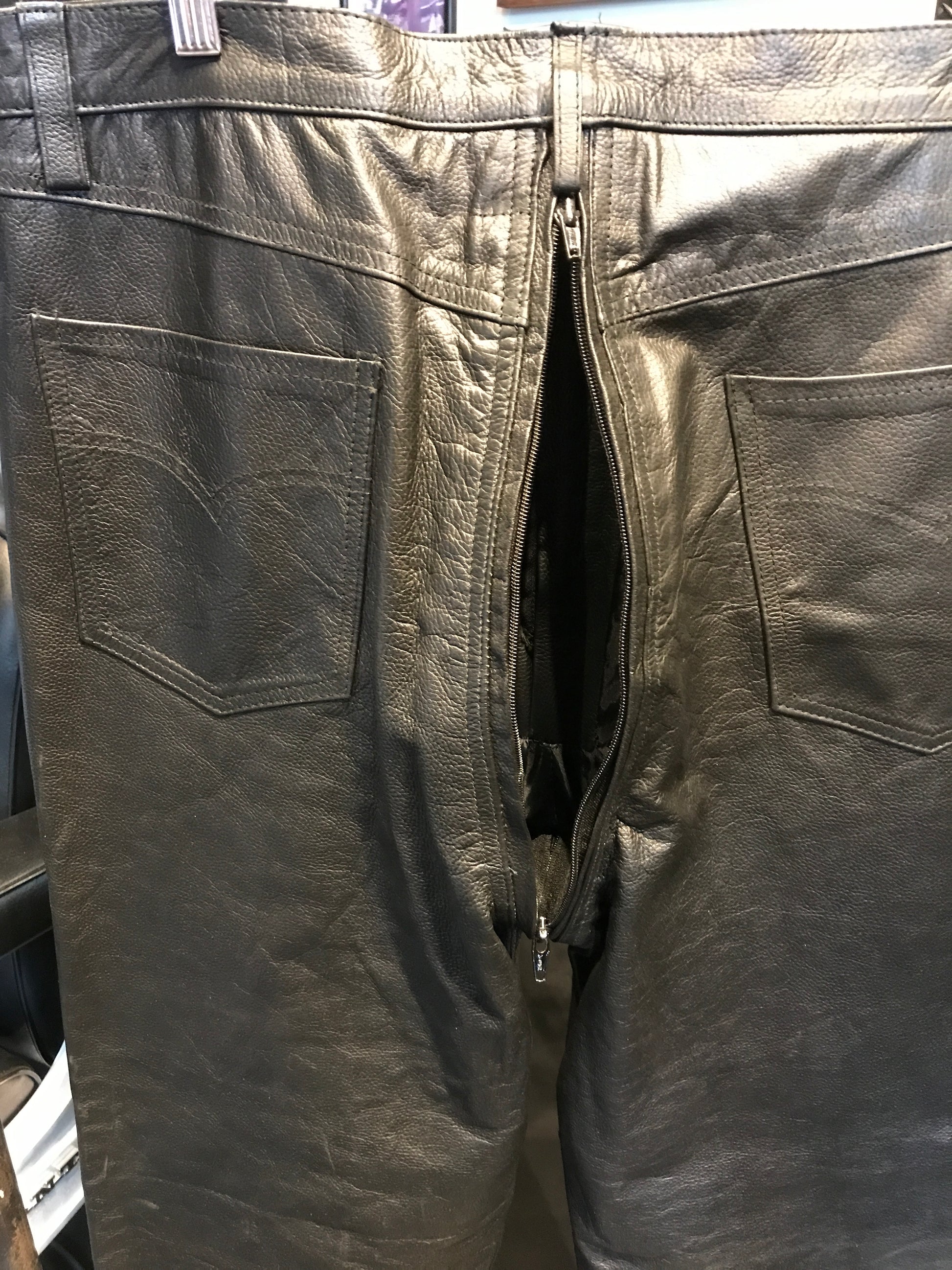Men’s leather five pocket pants with zipper in seat, size 42. 36” inseam